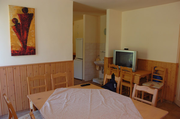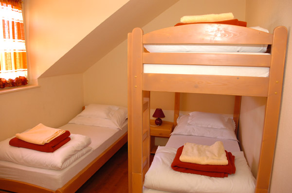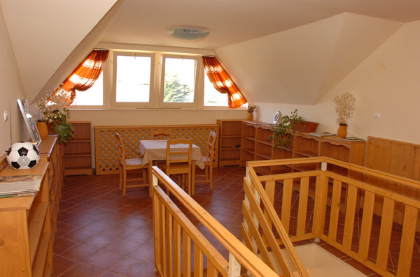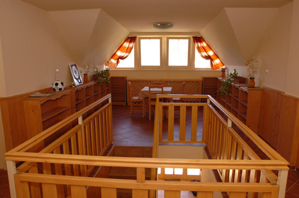 A szobák az emeleten vannak, és ott található egy tágas társalgó is.